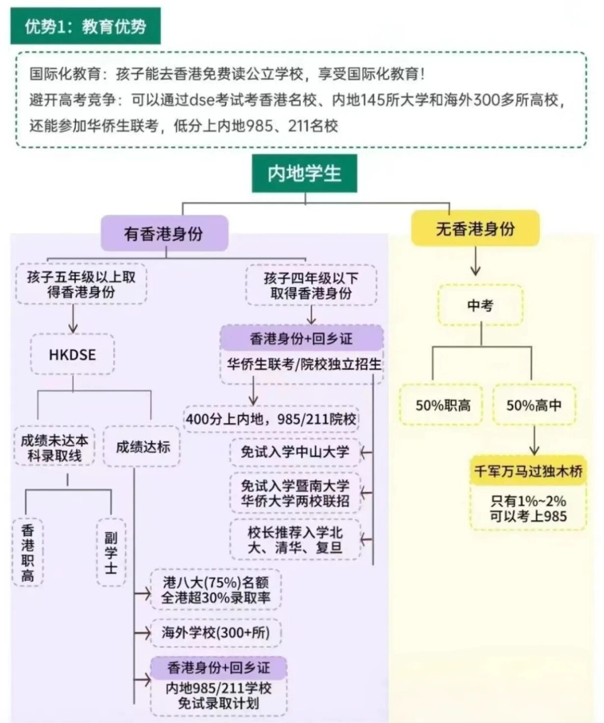 子女拿香港永居身份,還可以參加港澳臺華僑生聯招,400分左右可以就讀內地211、985(內地考生無此資格)。