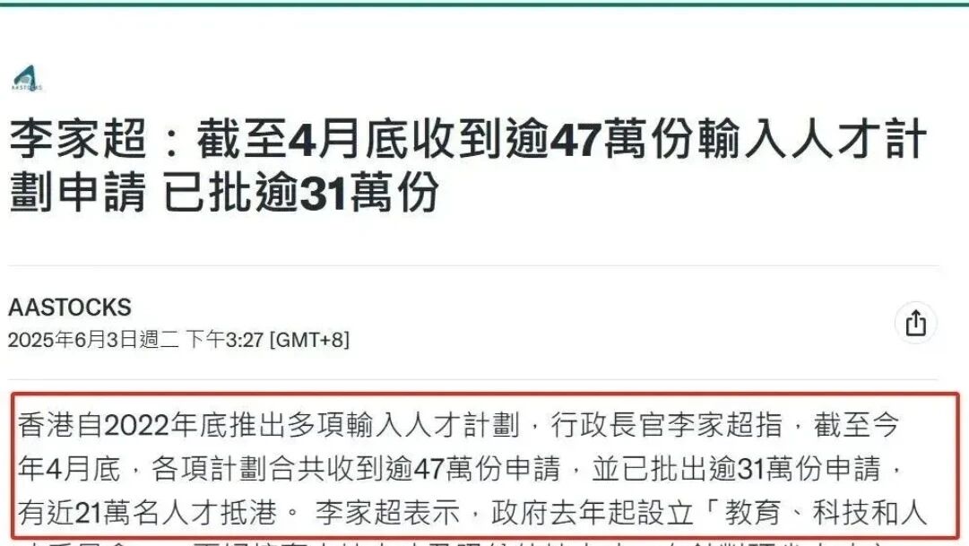 這也是中產階級齊刷刷去“卷”香港身份的原因。根據港府官方的數據,從2022年人才計劃開啟到2025年4月底,香港一共收到超過47萬份申請,超31萬份已經獲批。